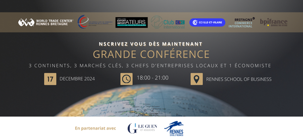 Le Cabinet Le Guen et Associés est partenaire de cet évènement ! La Bretagne, terre d’ouverture et d’innovation, occupe une place stratégique dans le commerce international français. En 2023, les exportations bretonnes ont atteint près de 13 milliards d’euros, avec des secteurs clés tels que l’agroalimentaire, l’automobile, le numérique ou l’industrie cosmétique. Ces performances reflètent le dynamisme des entreprises locales qui, malgré un contexte économique global marqué par des incertitudes géopolitiques, continuent d’élargir leur présence sur les marchés internationaux. C’est dans cet esprit d’ambition et de résilience que nous avons souhaité réunir un panel exceptionnel d’intervenants pour explorer les opportunités et les défis sur trois zones géographiques : l’Amérique latine, l’Afrique de l’Ouest et l’Asie du Sud-Est. Ces régions, riches en potentiel, offrent des perspectives stratégiques pour les entreprises bretonnes désireuses d’accélérer leur croissance à l’international. Préparez-vous à vivre une réelle odyssée ponctuée d’interventions et de retours d’expériences d’experts et de chefs d’entreprises. Que cette soirée soit pour vous une source d’inspiration et de perspectives concrètes pour vos ambitions à l’international ! Informations complètes et inscriptions : https://www.wtc-rennes-bretagne.com/events/grande-conference/