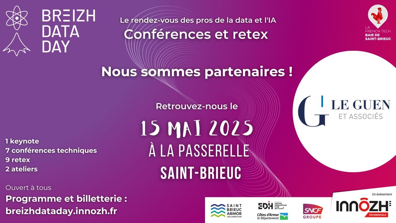 Le Breizh Data Day a lieu le 15 mai 2025 à La Passerelle, Saint-Brieuc. Conférences, RetEx, c’est LE rendez-vous des spécialistes de l’IA et de la Data. Le CABINET LE GUEN & ASSOCIES est partenaire de l'événement. Vous avez des questions sur l'IA et la propriété intellectuelle ? Venez les poser à Stéphane Bizet , présent toute la journée sur le stand partenaire du cabinet.